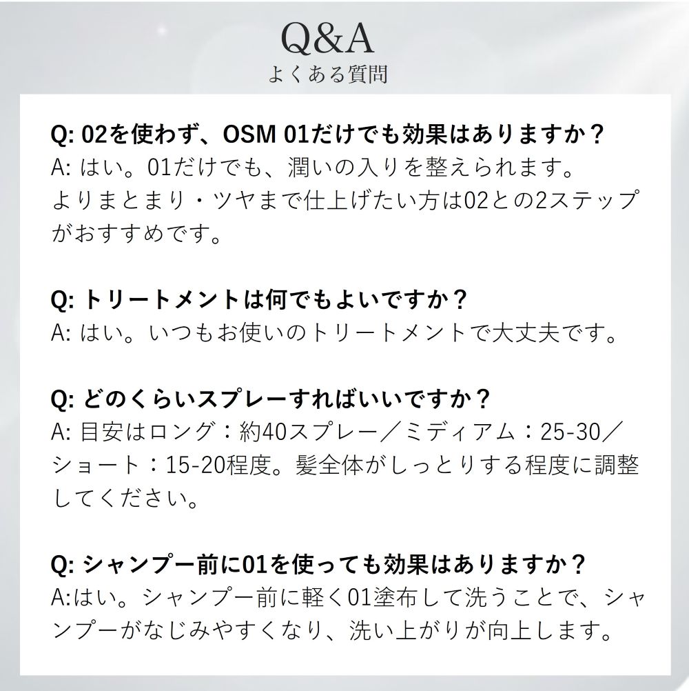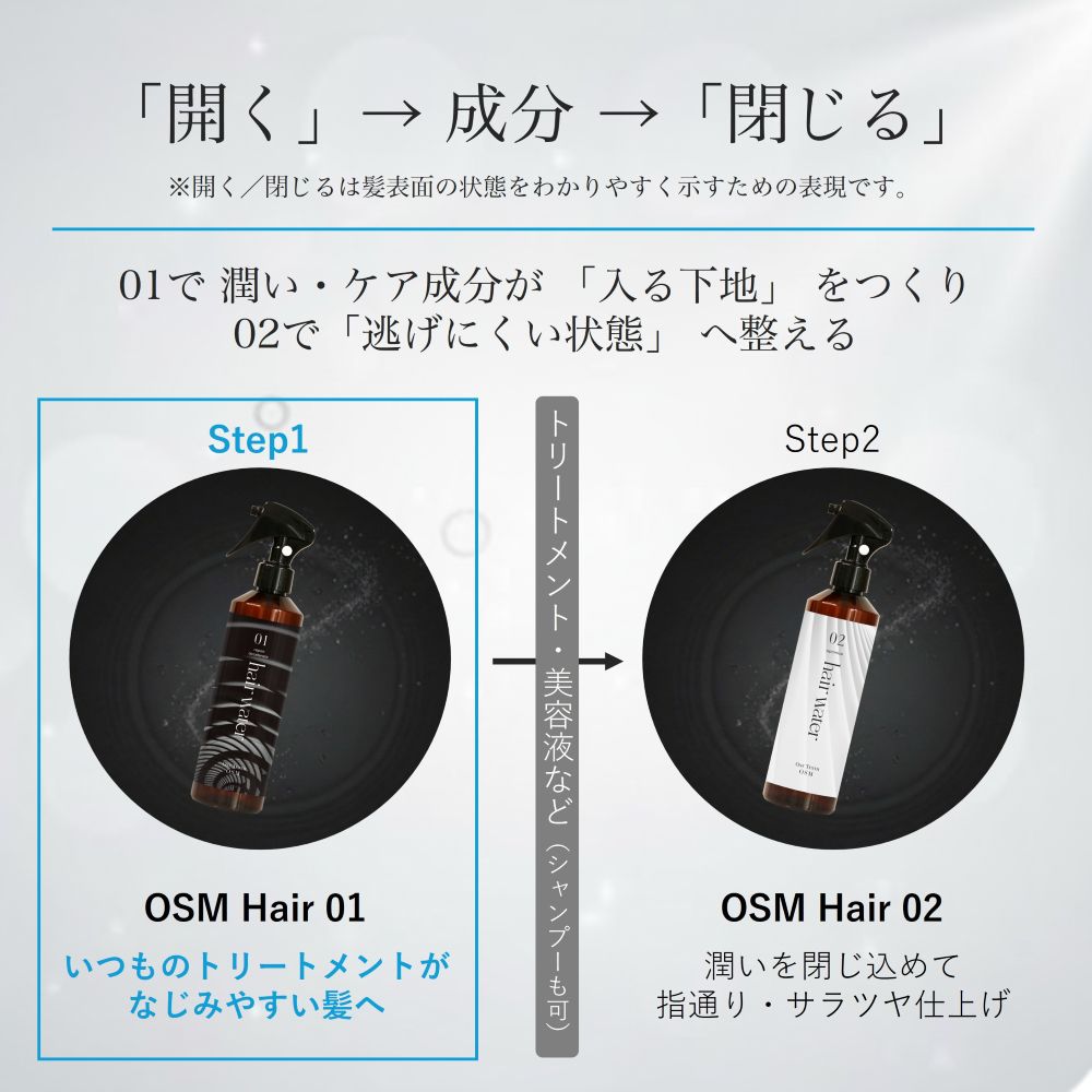 別売りの「OSM Hair Water 02」と併せてお使いいただくのもおすすめです。「OSM 01(導入)→ OSM 02(定着)→ ブロー」の順でお手入れすることで、髪の潤いがさらにアップし、驚くほどサラツヤな手触り感が生まれます。