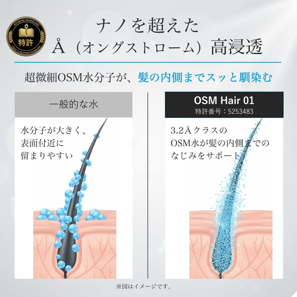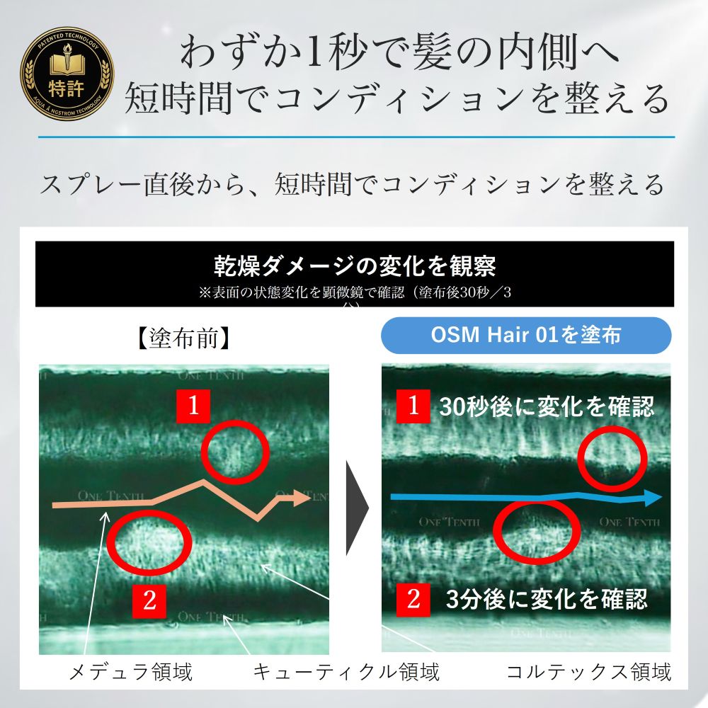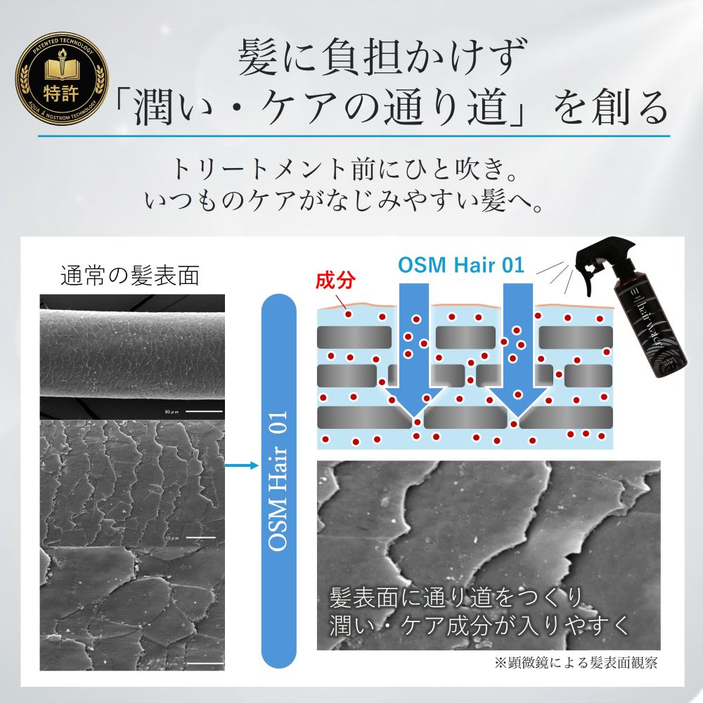 OSM Hair Water 01は、いつものケアに「一吹き」するだけで、髪の水分量を高め、トリートメントの効果を最大化する「高浸透ブースター(導入水)」です。