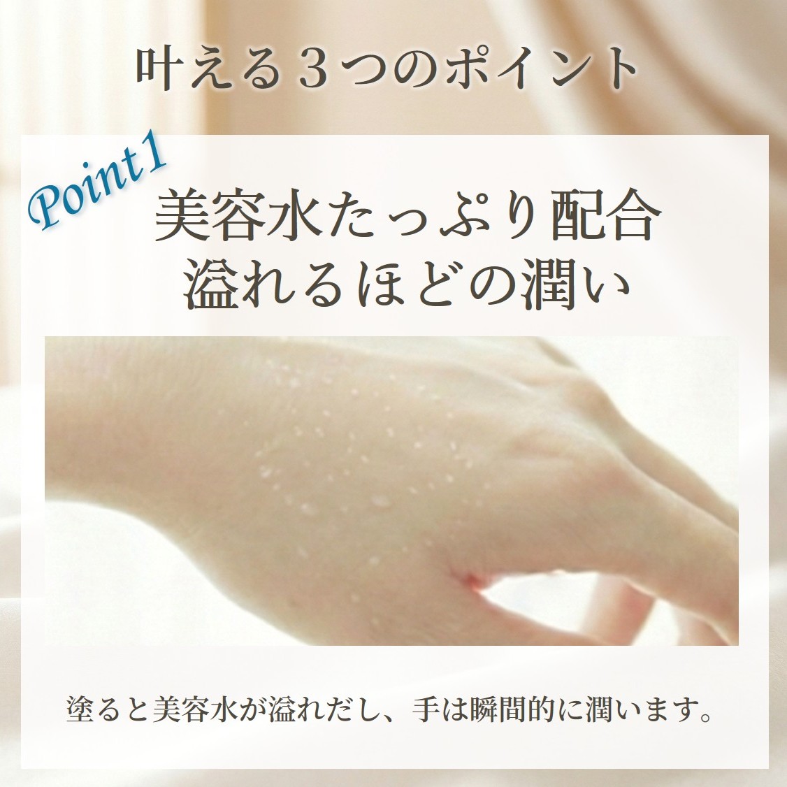 パール1粒分(乾燥がひどい場合は倍量)を手の甲に出し、馴染ませます。溢れてきた美容水をさらにマッサージするように優しく塗り込むことで、しっとりと整えます。