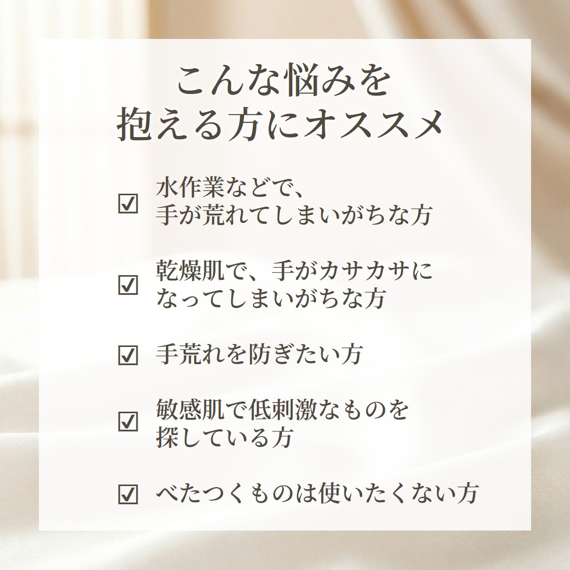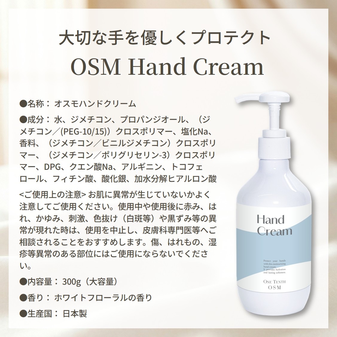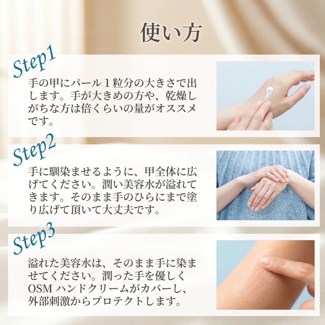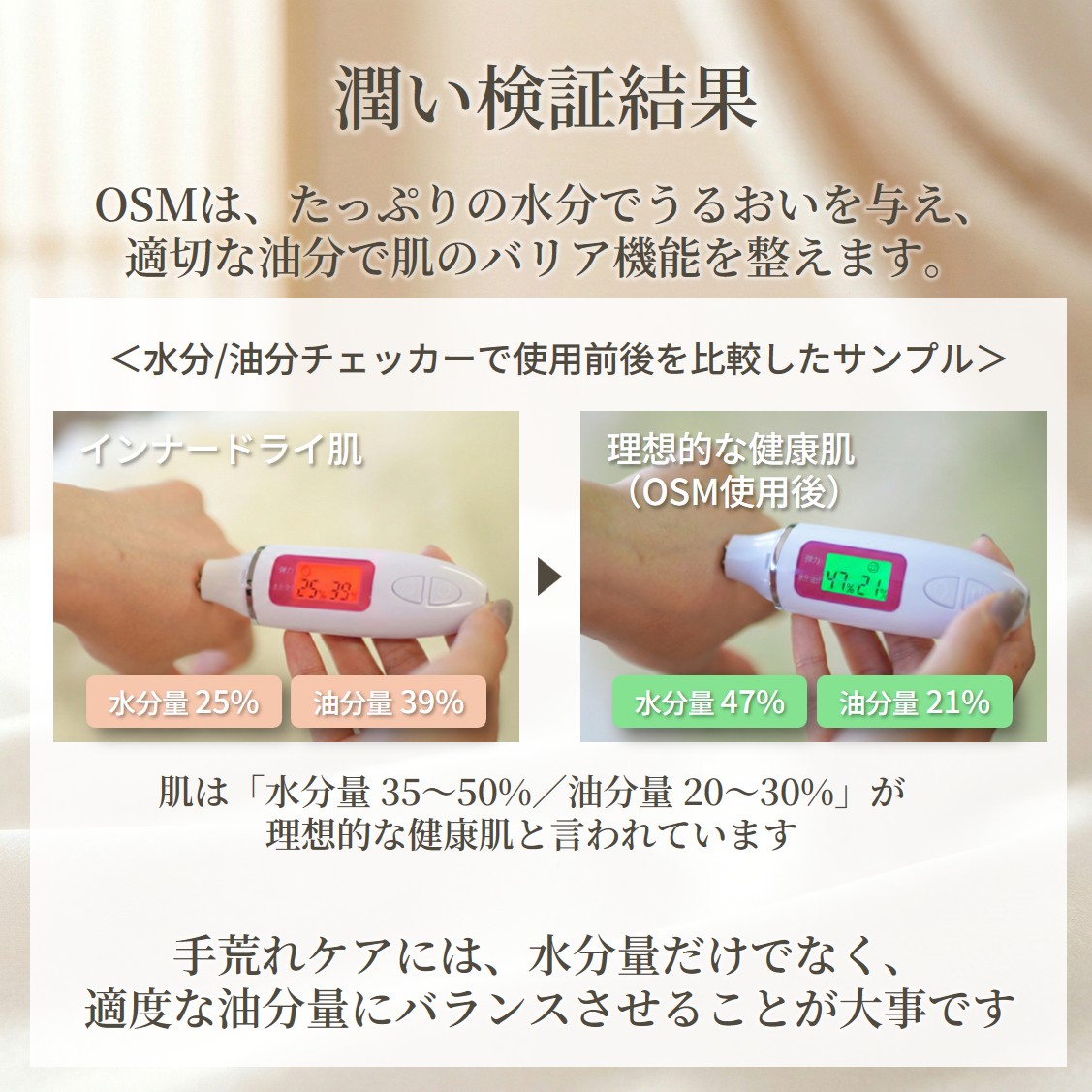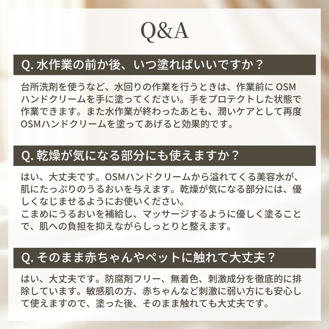 OSM Hand Creamは、繰り返す水仕事や外部刺激から大切な手を「守り、潤す」ために開発されたプロテクトクリームです。