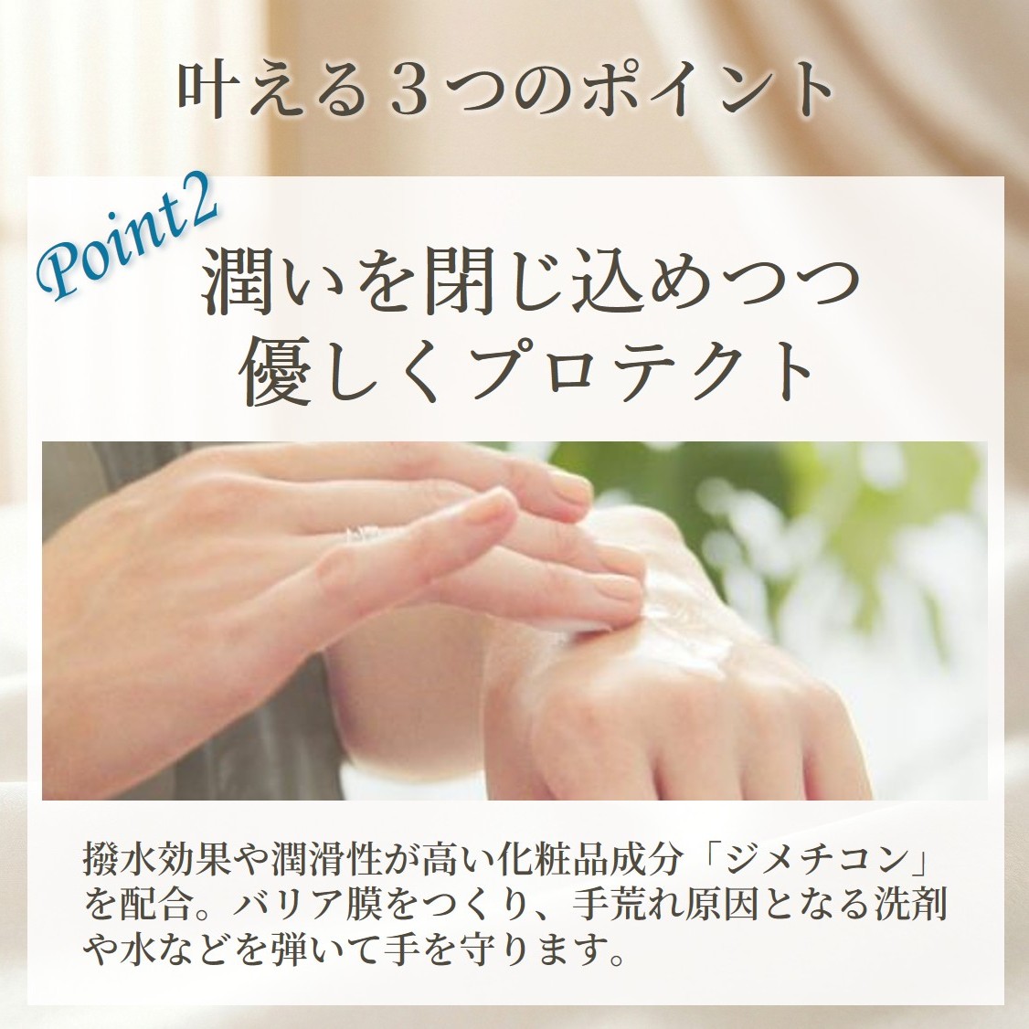 肌に伸ばした瞬間にクリームから美容水が溢れ出し、角質層へ水分を急速チャージ。同時に表面に形成される保護膜が、洗剤や乾燥などのダメージ要因をブロックし、内側はみずみずしく、外側は強いバリアで守られた理想的な手肌環境へ導きます。