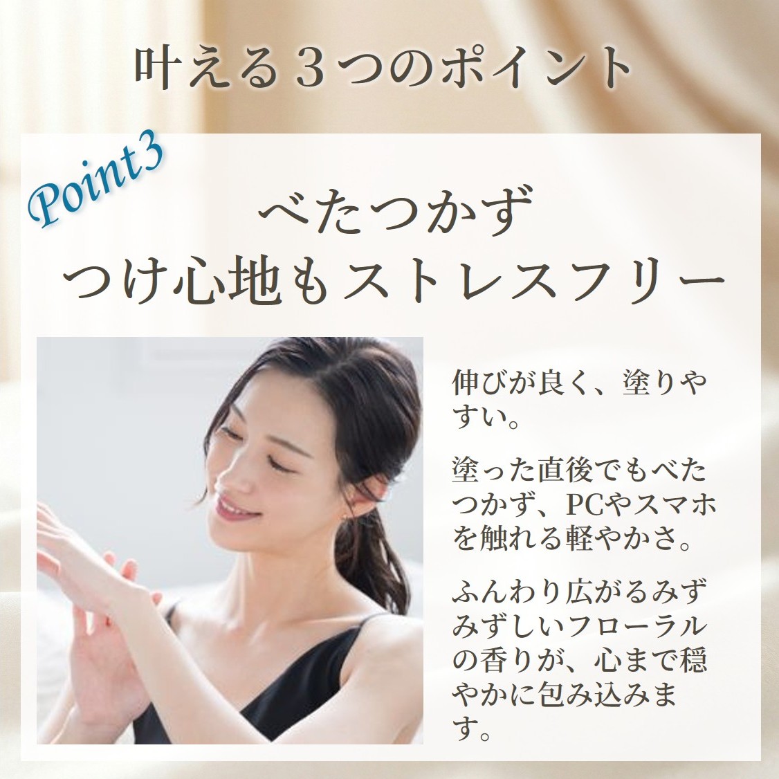 高保湿でありながら、油分量を理想的なバランス(20〜30%)に調整。塗った直後でもPCやスマートフォンを操作できるほど、さらりとした軽やかな使い心地を実現しました。赤ちゃんやペットに触れても安心な低刺激処方です。